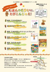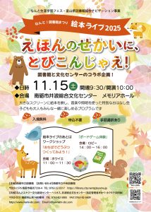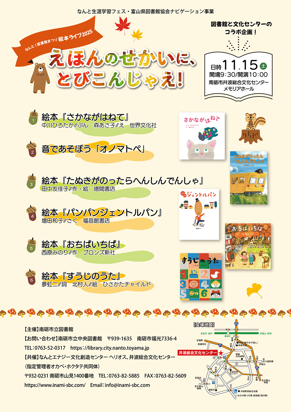 なんと!図書館まつり 絵本ライブ2025 えほんのせかいに、とびこんじゃえ! 図書館と文化センターのコラボ企画! 大きなスクリーンに絵本を映し、音楽や照明を使った特別なおはなし会 子どもも大人もみんな一緒に楽しめるプログラムです ◆絵本ライブのあとはワークショップ 「おちばでどうぶつつくってみよう!」 会場:ホワイエ 11:00~11:30 ◆「ボードゲーム体験」 会場:ロビー 14:00~16:00 |