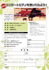 第18弾 コンサートピアノを弾いてみよう!! (YAMAHA(ヤマハ)CF3 フルコンサートグランドピアノ) 大ホールでコンサートピアノを弾いてみたいと思っている方、 メモリアホールのステージで弾いてみませんか? 発表会の練習曲を弾いてみたり、お好きな曲を弾いてみたり! ぜひこの機会に体験してみてください。 対象:小学生以上 午前 10:00~12:00 (10:00~11:00、11:00~12:00) 午後 13:00~17:00 (13:00~14:00、14:00~15:00、 15:00~16:00、16:00~17:00) 夜間 無 ご利用について ・発表会での使用は出来ません。 ・1時間単位でのご利用となります。(準備、片付含む) 例 〇10:00~11:00 〇10:00~12:00 ×10:00~11:30 ×10:30~11:30 ・照明は基本的なものとし、CD等再生機器は各自で準備してください。 ・事前にピアノの調律は行いません。 ・客席は前から5列(あ列~お列)までの解放とします。 ・飲食はロビーでお願いします。 ※イベント等でホールの利用がある場合はご予約の変更をお願いする場合がございます。 ※発表会、ミニコンサート等で使用される場合は通常通りのホールのご利用になります。 ※空き日のご確認はお電話でもできますので、お問い合わせください。 申込書は井波総合文化センターにありますので、 ご記入のうえご提出ください。 コチラからダウンロードも可能です。 必要事項をご記入のうえ、お申し込みください。